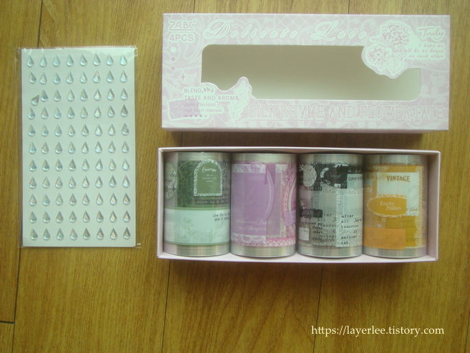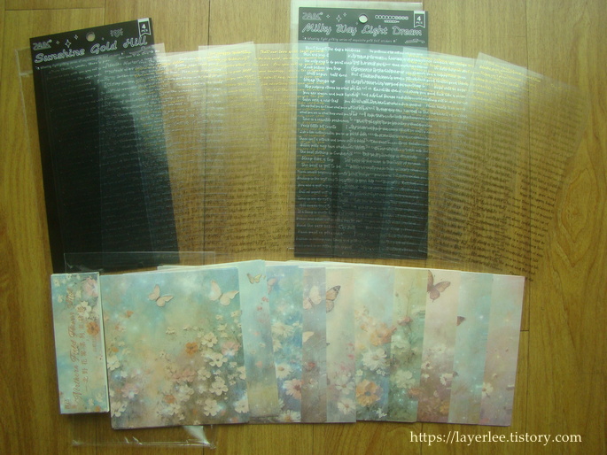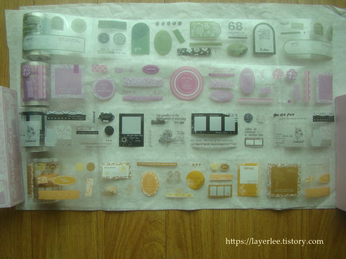 금은색 투명 PET 레터링 스티커 두 개와 배경지입니다. 레터링은 4디자인으로 품절되지 않은 옵션을 다 구매했어요.