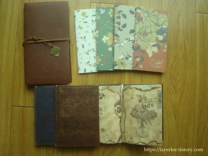 다이어리와 노트입니다. 트래블러스 노트가 두 권 있는 인조 가죽 커버 다이어리와 꾸준히 사용 중인 미니 노트입니다.