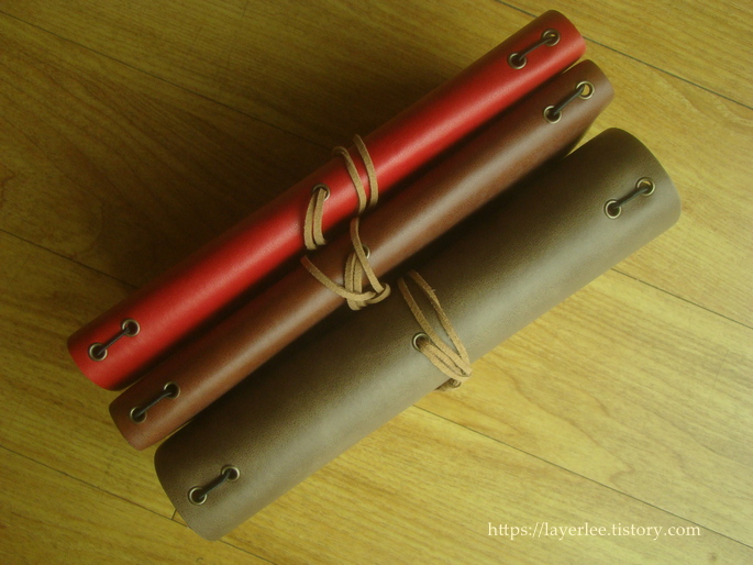 가죽 다이어리는 이번이 3번째여서 비교 사진을 찍었어요. 가운데가 이번에 구매한 갈색입니다.