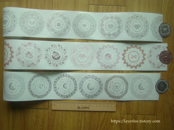 원형 레이스 보더가 각각 칼선이 있는 마스킹테이프입니다. 5가지 패턴이 반복됩니다.